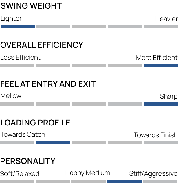 Das Comp ist ein kurzes, breites Blatt, das im Durchzug sehr stabil liegt – das schafft Vertrauen beim Krafteinsatz und erhöht den Gesamtkomfort. Das „Gefühl in der Hand“ bzw. das Schwunggewicht ist geringer als bei Riemen mit größeren Blättern – das spart Energie und erleichtert höhere Schlagzahlen.