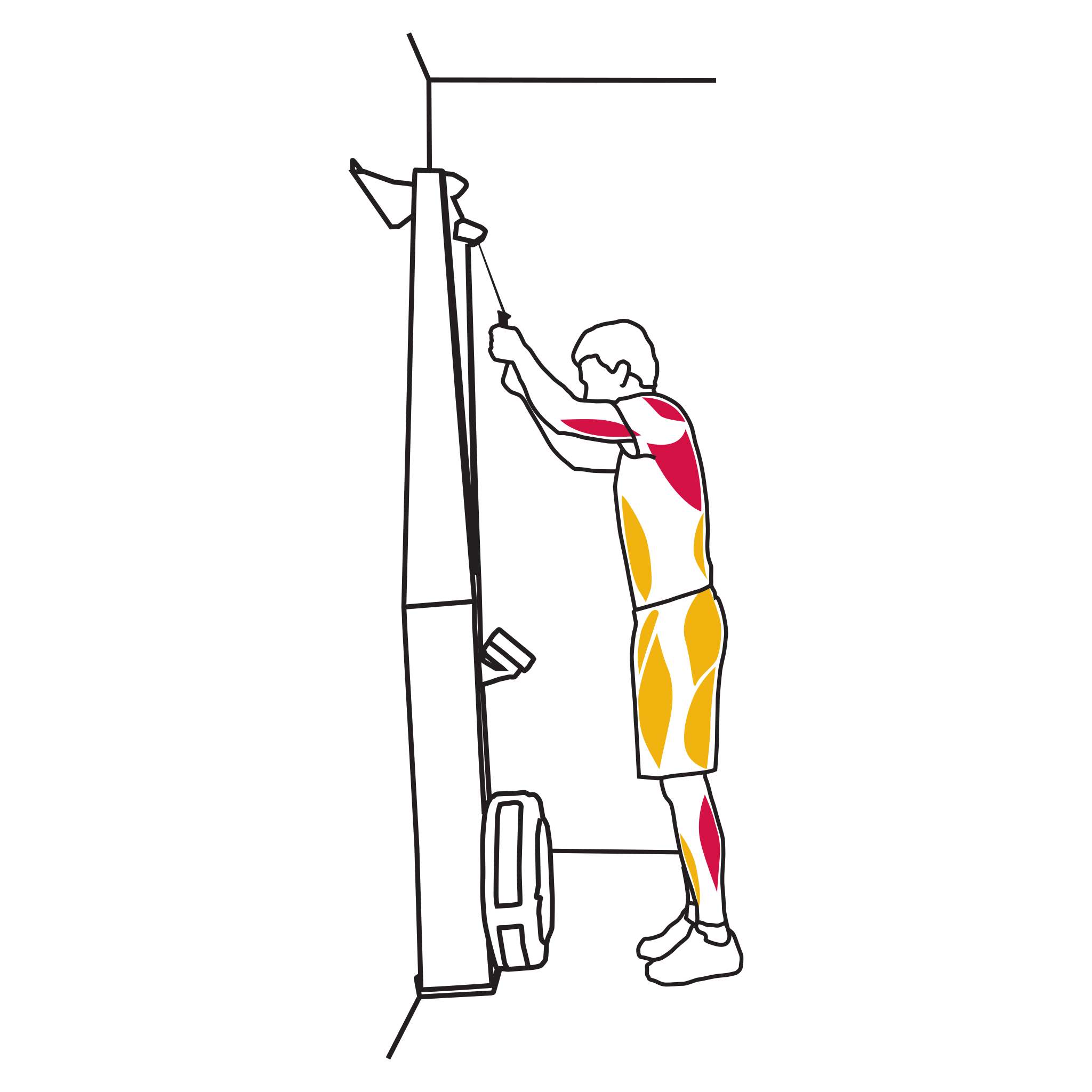 - Primäre Muskeln: Trizeps, Latissimus, Bauchmuskeln, Hüftbeuger, Schienbeinmuskulatur